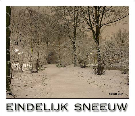 eindelijk dan! het is helaas al hartstikke donker, maar goed….. gauw een fotootje gemaakt voordat het allemaal weg is. jammer dat het nou niet overdag sneeuwde.