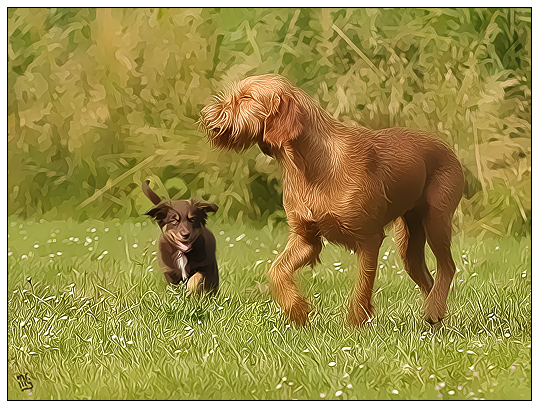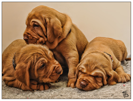 Een vriendin van vrouwtje heeft een puppy. Die zag ik gisteren voor het eerst en die vond ik op zich wel OK. Pupje deed niet veel, maar hing dus ook niet aan mijn oren of mijn lippen ofzo. Vandaag wéér gezien en nu was het wel iets drukker om me heen. Op een gegeven moment wilde een enge grote hond naar dat puppy lopen en toen ben ik er maar tussen gaan staan. Weet ik veel wat zo’n dikkerd doet met dat ukkie. Daarna nog een keer beschermd en ik geloof dat dat wel gewenst was. Ik was lief!