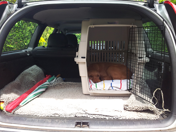 Ztje vond het allemaal weer best. Toen we donderdag alles aan het inpakken waren, ging ze maar vast in de bench liggen zodat we haar niet konden vergeten. Nou, met een enorme tas hondenspullen was die kans niet echt groot. We hadden ruimte genoeg en op de boot was het weer erg makkelijk om alles vrij te maken zodat ze de hele achterbak heeft en haar eigen bench. De deur van de bench staat dan natuurlijk open.