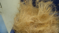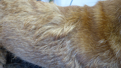 Onderstaande foto’s zijn van tijdens de trimbeurt. Op de foto links is goed te zien waar het oude haar nog zit (links) en waar al getrimd is en waar mooi nieuw donker haar alweer zit.