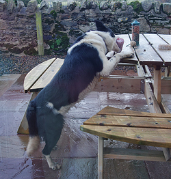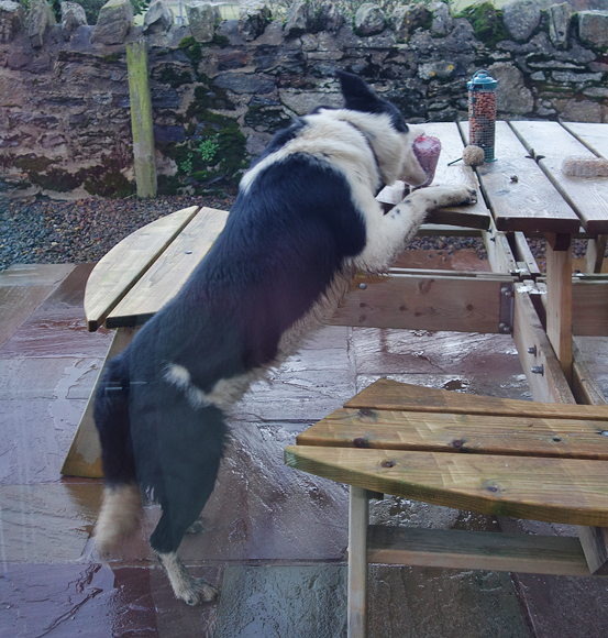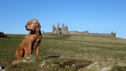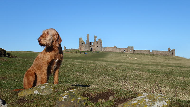 Het blijkt al druk in Craster. Het is 10 uur als ik parkeer en ik moet al naar boven rijden naar de quarry om te kunnen parkeren. Dat zou wel eens kunnen betekenen dat het castle geopend is….. Maar ik ga het toch proberen en vol goede moed en zin gaan we op pad. Ik besluit vanaf een afstandje al de eerste opnames te maken. De controller werkt gelukkig goed met mijn oude telefoon dus dat is geen probleem. Koud is het ook niet omdat het niet waait en ik hoef niet eens mijn nanopuff aan te trekken. Woef wacht geduldig in het zonnetje totdat ik klaar ben. Dit had ik dus niet kunnen doen toen ze loops was, want ik kan haar niet gelijktijdig in de gaten houden. Ik heb al moeite genoeg om op mijn drone te letten eigenlijk.