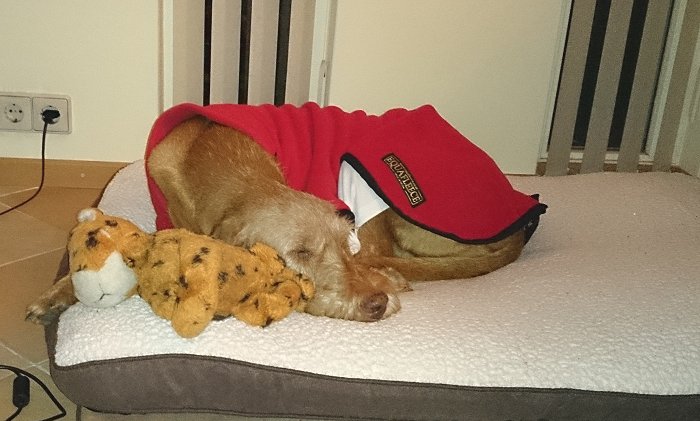Het is alweer twee jaar geleden dat woefje geopereerd werd aan het mastocytoom. Op 11 november reed ik naar Zierikzee met haar. De operatie ging destijds prima, en ze knapte al snel weer op met haar hemdje aan.
