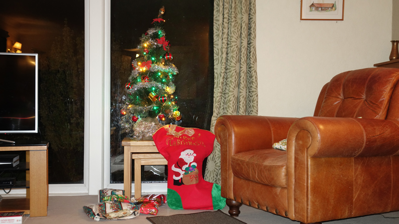 Het huis is verlicht en de eigenaar zit TV te kijken. Hij doet ons open en verwelkomt ons. Hij is 82 weet ik inmiddels en woont een uurtje bij de cottage vandaan. We krijgen een korte rondleiding waar we niets van onthouden en daarna vertrekt hij weer. Eindelijk kunnen we dus uitpakken en alles een beetje inruimen. In ons ‘oude huis’ weten we precies waar we wat gaan laten maar nu moeten we alles ontdekken. Maar het lukt natuurlijk en al snel zitten we lekker in de woonkamer die aangenaam warm is. Er is zelfs een kerstboom die leuk is van kitcherigheid en overal hangt hulst. Gezellig! Morgen verder kijken want we zijn erg benieuwd naar de grote tuin en het uitzicht hier.