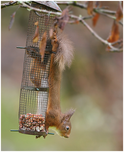 Gisteren heb ik natuurlijk een paar keer geprobeerd het eekhoorntje te vangen. Ik vond de foto van het diertje op de stronk erg mooi vanwege de houding. Later op de middag zat de eekhoorn ineens aan de andere kant van de tuin bij de boom midden op het grasveld waar we de vogeltjes voeren. Die voederaar vond hij ook wel interessant en blijkbaar vormt zoiets geen enkel probleem.