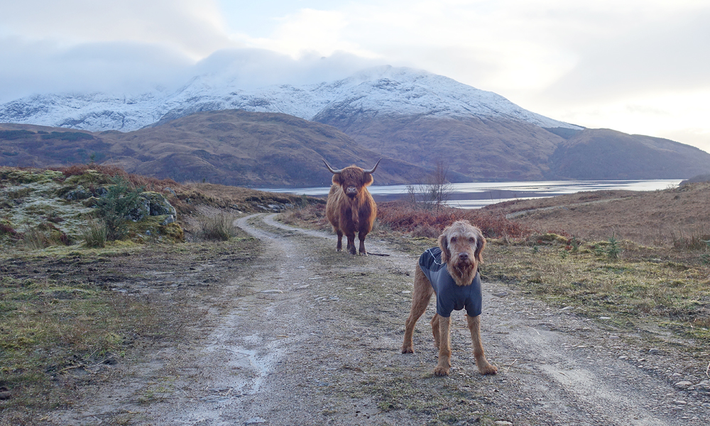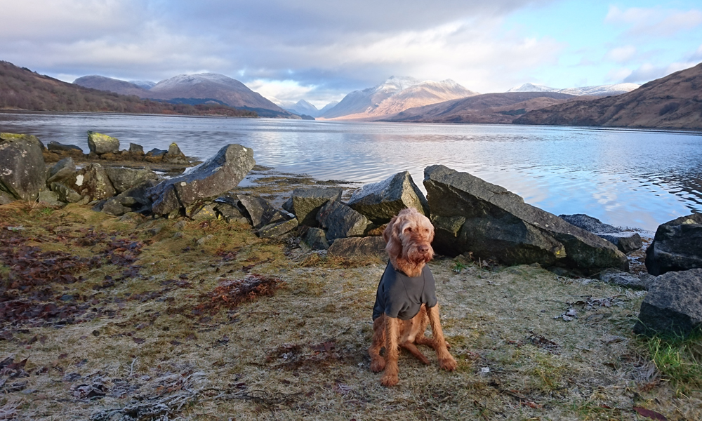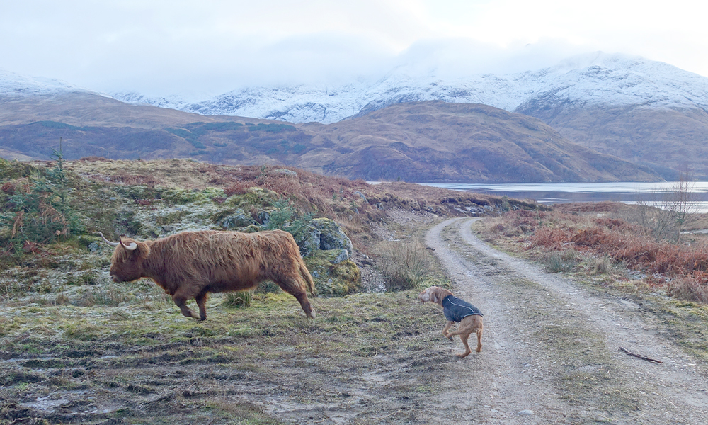 Het is niet erg druk maar wel mistig onderweg. Dat rijdt niet echt geweldig maar ik doe rustig aan. We laten woefje weer uit bij het meer waar de boten over Loch Lomond varen zodat ze lekker uitgeweest is. We hebben onderweg de eigenaar van de cottage ook al gebeld dat we pas na 22 uur aan zullen komen en dus niet meer gaan bellen aangezien hij vroeg op pad wilde de volgende dag.