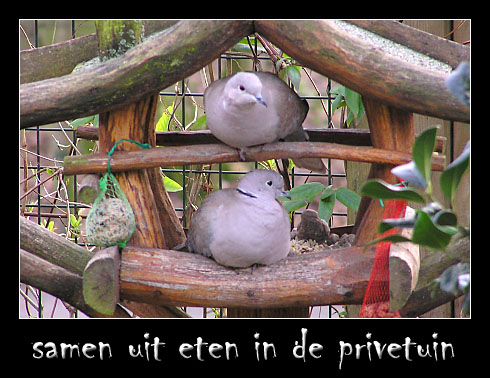 beetje rare foto, maar ik zag ze zitten en probeerde snel een kiekje te maken. vond het zo schattig. ze zitten wel vaker zo. samen uit eten. jajajaja zij hebben wel een stemmetje want ik hoor ze geluiden maken op het dak. ben toch benieuwd waar mijn stem gebleven is