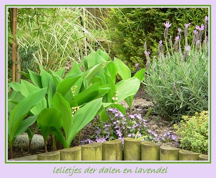 het is grappig om te zien hoe snel alles uitloopt in de tuin. de lelietjes krijgen langzaam aan schattige kleine bloemetjes. ze staan vlakbij paarse bloemen en de paarse vlinderlavendel, dus dat is een mooie kleurencombi. ook de grassen (waarvan een klein stukje op de foto te zien is) die rond het watertje staan lopen snel uit. de druif heeft de knip beurt overleefd, de appelboom komt langzaam in de bloesem te staan en de grote lelies komen ook weer boven de grond na aanvankelijke aarzeling. als alles zo blijft bloeien staan er aardig wat bloeiers straks in de tuin. zelfs de aconieten die ik verplaatst heb komen netjes weer naar boven. op de nieuwe plek kunnen ze lekker uitzaaien.