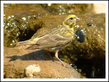 hier nog het vogeltje uit spanje. een een of ander geel soort sijsje denk ik. ik had hem bijna over het hoofd gezien daar tussen dat water en rotsjes.